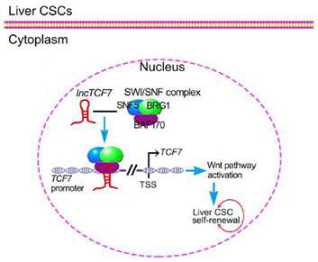 中国科学院生物物理所的范祖森研究员带领的研究小组于2015年8月31日在国际学术期刊《Journal of clinical investigation》上在线发表了一项名为<ZIC2-dependent OCT4 activation drives self-renewal of human liver cancer stem cells>的最新研究论文,首次报告了他们在肝癌干细胞(liver CSCs)中发现转录因子ZIC2的高表达,并且这一效应对维持肝癌干细胞自我更新的作用机制起到了重要的作用。在本研究中,经转录组芯片分析,我们确定了一个长链非编码RNA(lncRNA),命名为lncTCF7,它在肝癌肿瘤和肝脏CSCs中高度表达。 LncTCF7是肝脏CSC自我更新和肿瘤增殖所必需的。研究发现lncTCF7招募SWI / SNF复合物到TCF7的启动子区域以调节其表达,从而导致Wnt信号传导的激活。我们的数据表明lncTCF7介导Wnt信号通路启动肝脏CSC自我更新和肿瘤增殖。因此,总结来讲, lncRNA通过调节 Wnt信号通路,促进肝癌干细胞的致瘤活性,进一步突出了lncRNAs在肿瘤生长和增殖中的作用。