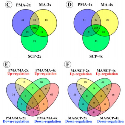 通过不同比较组之间差异基因韦恩图可以直观地显示出不同比较组之间共同的和特有的差异表达miRNA的个数,差异基因韦恩图具有明显的生物学意义,比如是相同对照不同处理的实验设计情况,可以将不同处理下的差异基因进行比较。