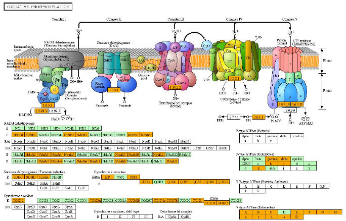 红色代表注释到某个ko节点且上调的显著差异表达基因,蓝色或紫色代表注释到某个ko节点且下调的显著差异表达基因。方框内的4位数字表示各种酶的EC编号;空心圆圈表示小分子化合物;实心箭头表示生化反应的方向;虚线箭头连接其他的相关代谢途径。本图仅为展示图片。