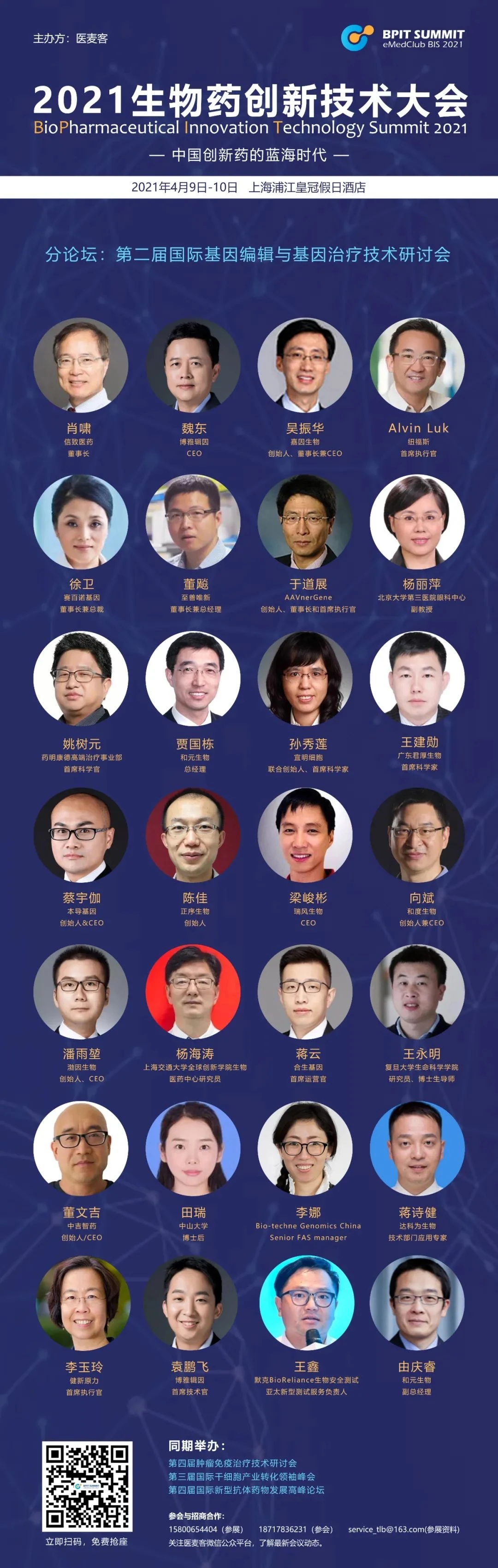 BPIT 2021生物药创新技术大会将会于2021年4月9日-10日在上海建工浦江皇冠假日酒店拉开帷幕。本届大会由医麦客主办,上海市闵行区科学技术委员会、上海临港浦江国际科技城发展有限公司指导,聚焦肿瘤免疫、新型抗体药物、干细胞再生医学、基因编辑与基因治疗等多个领域。