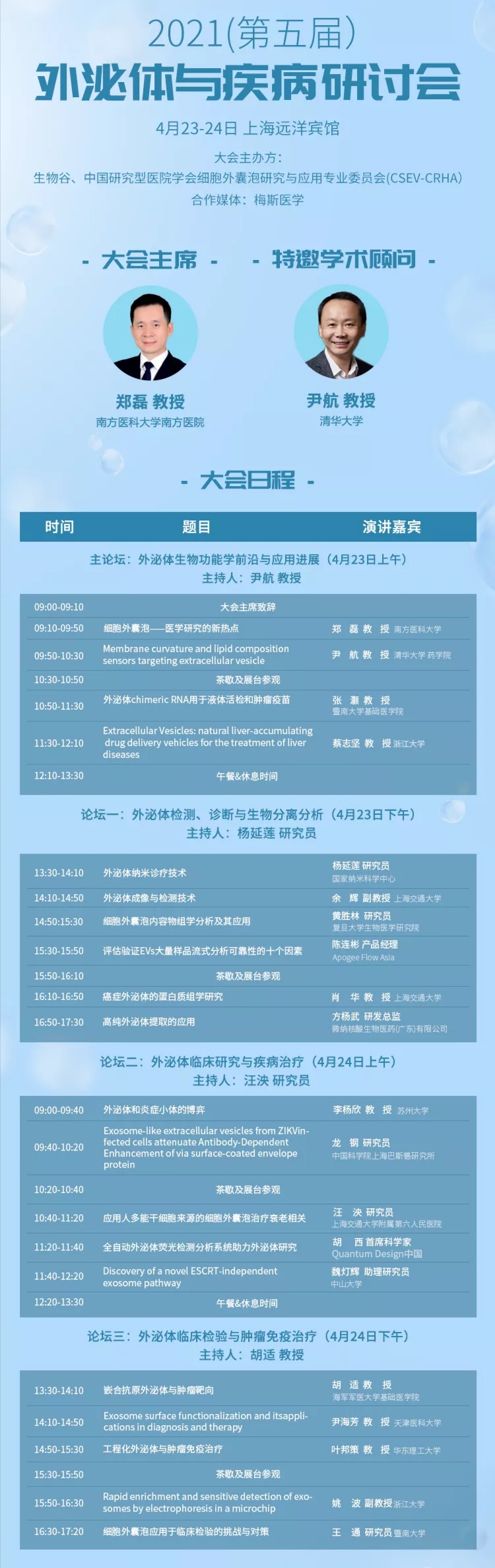 此次会议涵盖了围绕外泌体生物功能学前沿与应用进展、多学科交叉技术研究、临床研究与疾病治疗、外泌体作为诊断标志物和药物载体等内容,打造4大专业论坛,力邀20+大咖嘉宾,汇聚500+科研院所知名专家学者、行业领军企业管理层和医院相关科室临床医生等,共同探讨目前外泌体研究发展面临的主要问题,进一步加速外泌体研究成果转化!