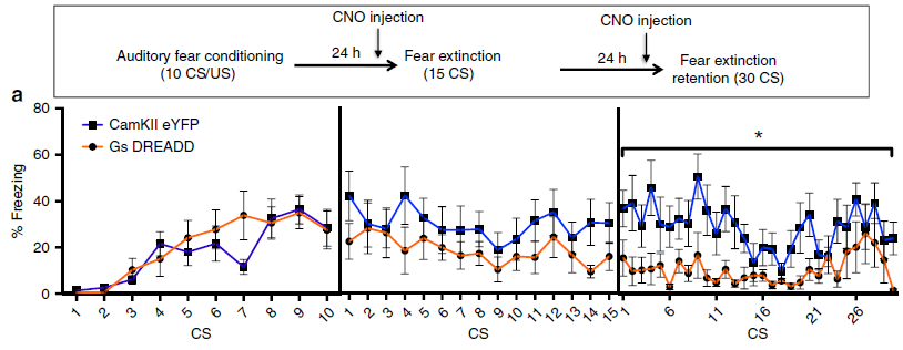 在Thy1-Cre鼠BLA注射兴奋性化学遗传学病毒AAV-DIO-Gs-DREADD-IRES-mCherry,同时以AAV-CaMKII-eYFP作对照,可见Gs- DREADD的表达局限在BLA,但是对照病毒的荧光则广泛地分布在整个杏仁核。在动物进行恐惧消退和消退维持实验前30 min于腹腔注射CNO。结果显示,在恐惧消退过程中,使用化学遗传手段增强BLA Thy1神经元的兴奋程度虽然使动物的恐惧行为出现下降,但相比对照动物这一变化在统计上并未表现出显著。然而在恐惧消退维持测试中增强BLA Thy1神经元的兴奋程度可以使动物的恐惧行为显著下降,这提示增加BLA Thy1阳性神经元的活动有助于恐惧记忆消退的巩固。