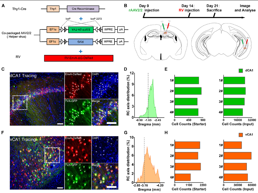 在Thy1-cre工具鼠的腹侧海马(vCA1)和背侧海马(dCA1)先后注射表达绿色荧光的Helper病毒和表达红色荧光的RV病毒,同时感染2种病毒的起始神经元(starter cell)共标记为黄色[2]。