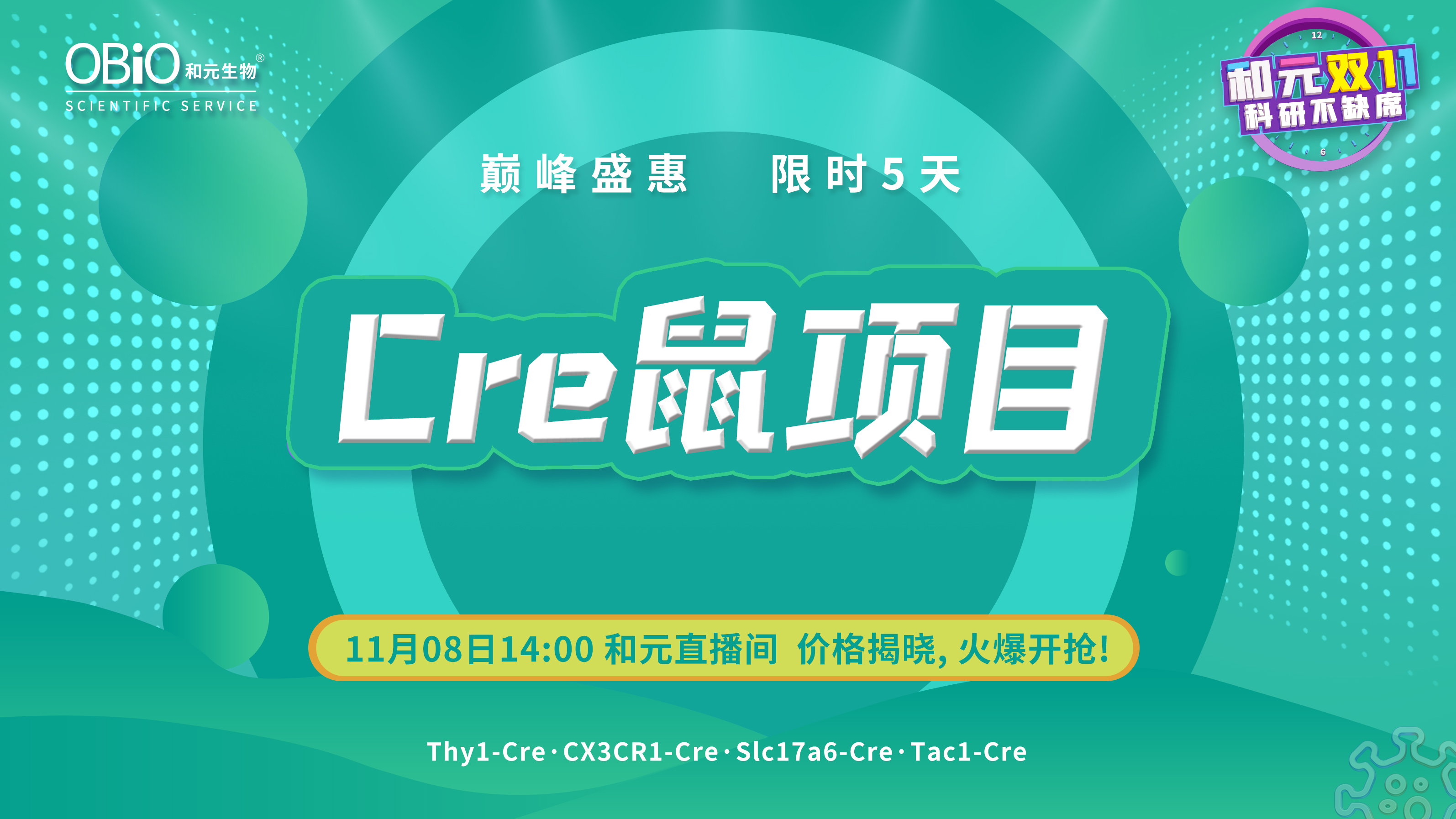 在全民双十一活动期间,米乐生物特推出直播间科研产品促销活动,包含病毒产品、外泌体、gRNA文库、动物模型构建、Cre鼠项目、双萤光素酶、单克隆敲除株等服务,折扣多多,福利满满,更有好礼相送!11月08日14:00米乐直播间,科研产品巅峰盛惠,火爆开抢!