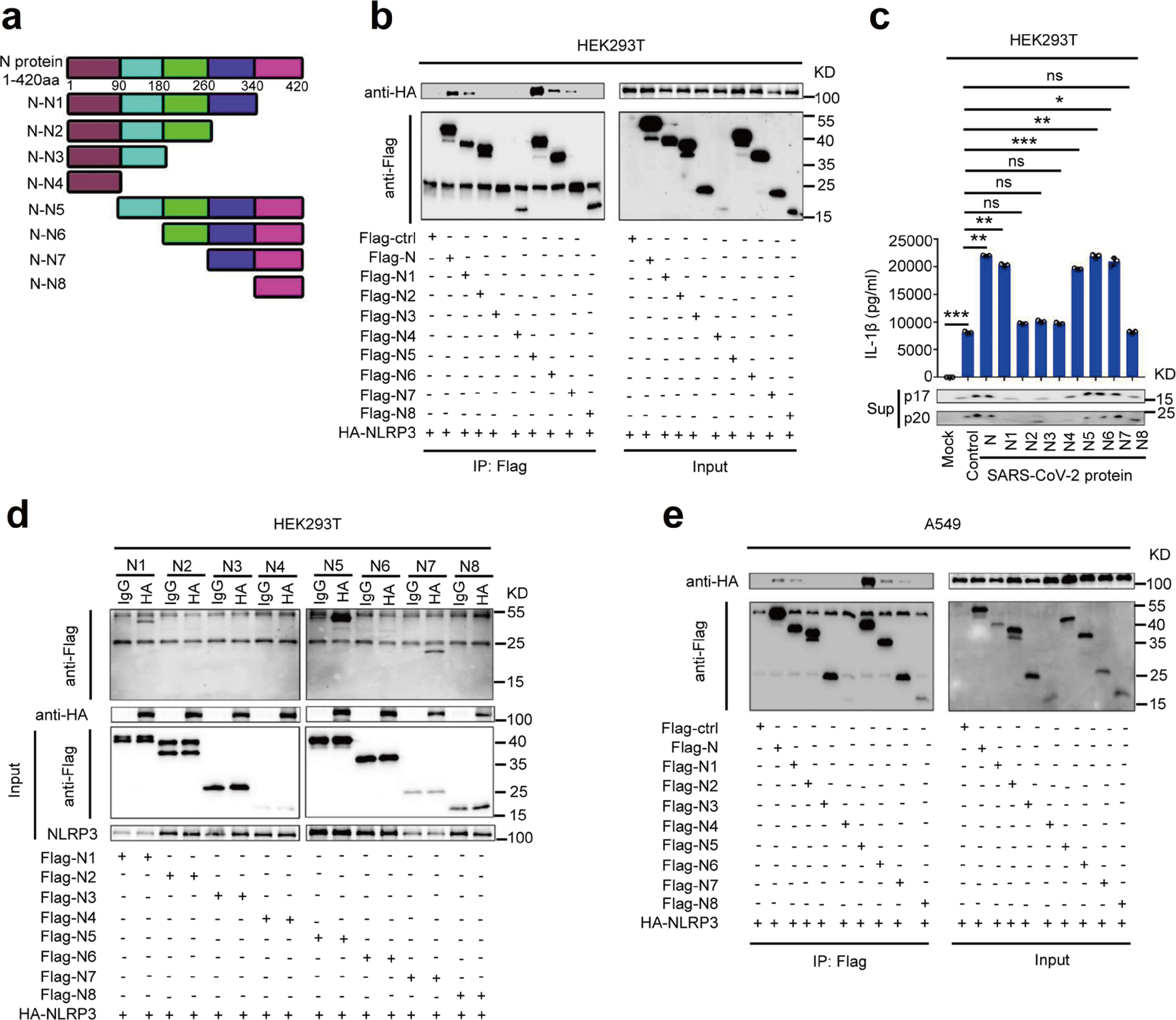 通过评估N蛋白的截短突变体N1-N8,鉴定参与NLRP3相互作用的SARS-CoV-2 N蛋白序列。结果表明,NLRP3蛋白与N1、N5、N6和N7相互作用,并且IL-1β分泌、IL-1β cleavage和Caspase-1 p20 maturation 亦受N蛋白N1、N5、N6和N7影响(Fig.4a-4e),因此,N蛋白260aa-340aa截短体参与了与NLRP3的相互作用并激活NLRP3炎症小体。