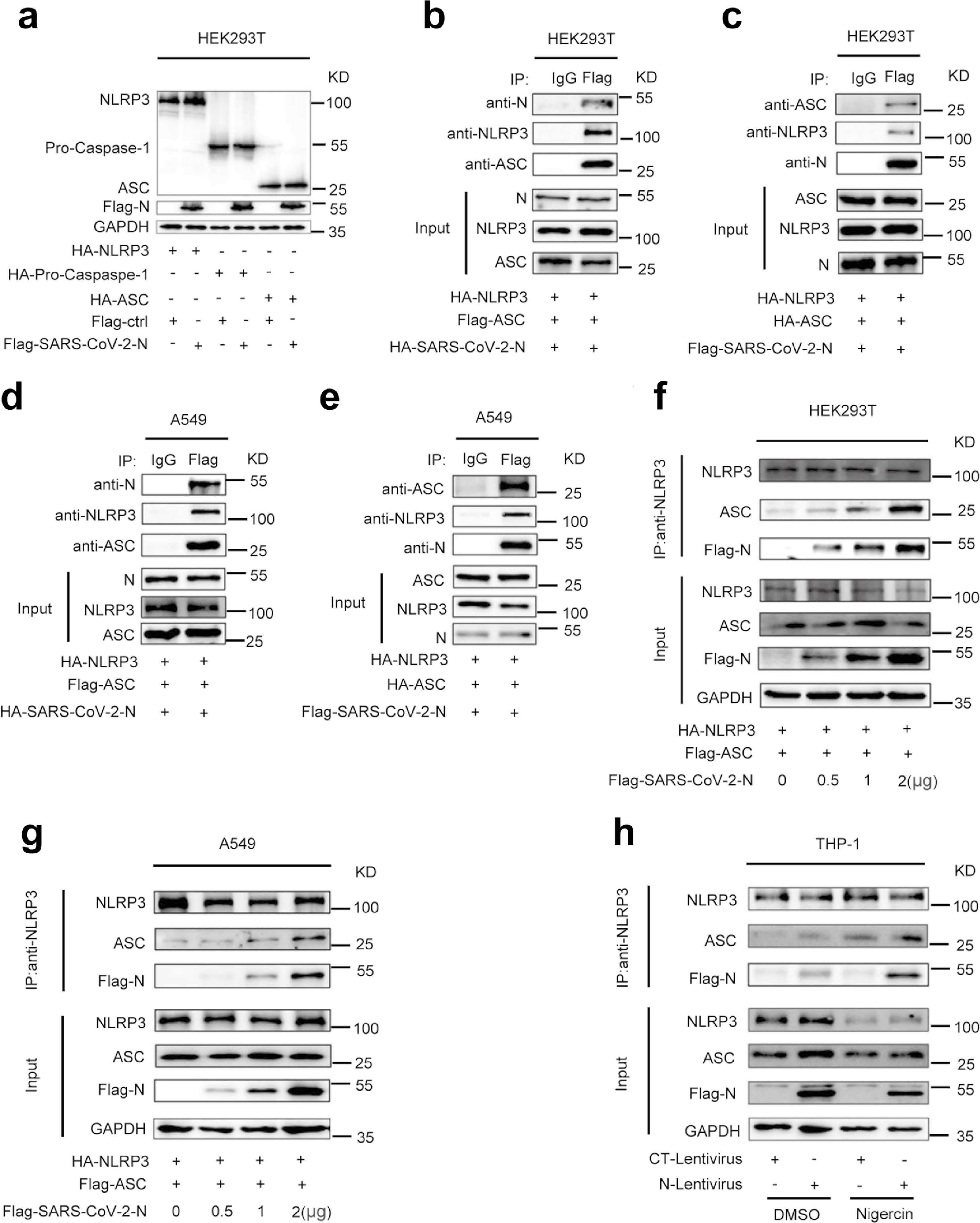 接下来研究人员对N蛋白在调节NLRP3炎症小体成分中的作用进行研究。结果显示,N蛋白对NLRP3、Caspase-1和ASC的蛋白水平没有影响,然而NLRP3存在时N和ASC可以相互免疫沉淀(Fig.5a-5e)。因此,该结果提示N蛋白、NLRP3和ASC三个蛋白可能形成一个复杂的N-NLRP3-ASC复合物。N蛋白增强NLRP3与ASC的相互作用在HEK293T和A549细胞并呈剂量依赖(Fig.5f-5g)。同样,在PMA-differentiated THP-1-N细胞中,Nigericin促进 N蛋白在NLRP3存在的情况下与内源性ASC相互作用(Fig.5h)。因此,SARS-CoV-2 N 促进NLRP3与ASC的相互作用。