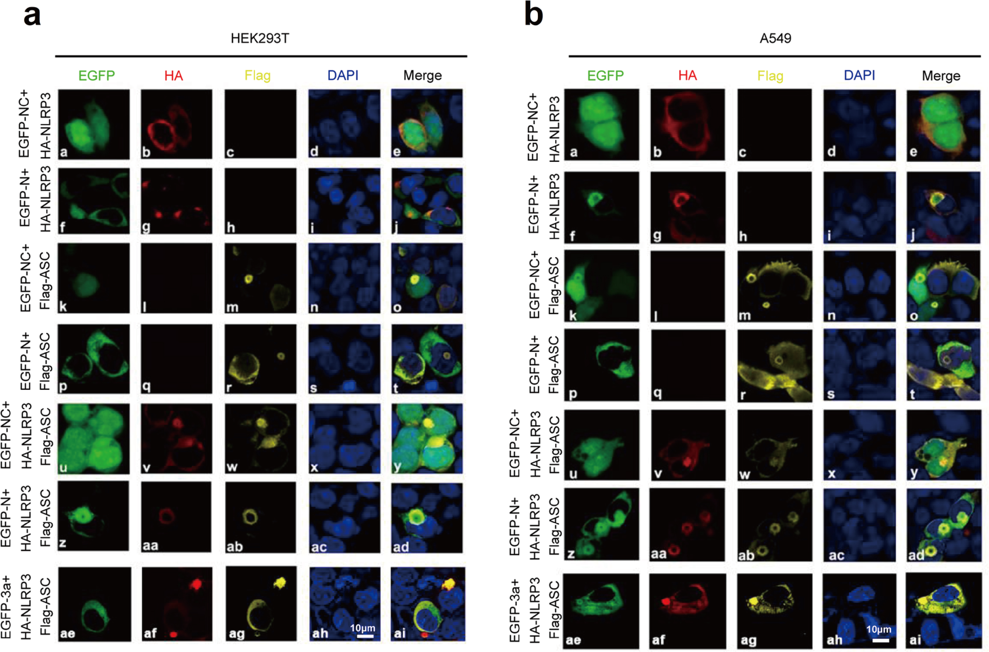 此外,研究人员还探究了N蛋白对NLRP3炎症小体复合物组装的影响。将HEK293T细胞或A549细胞共转染不同质粒,GFP同时分布于细胞核和细胞质中,NLRP3弥散状分布于细胞质(Fig.7a&7b(a-e));N蛋白和NLRP3表达时,NLRP3与N蛋白共定位,呈斑点状(Fig.7a&7b(f-j));GFP和ASC表达时,GFP与ASC同时分布于细胞核和细胞质中,并形成小的环状结构(Fig.7a&7b(k-o));N蛋白和ASC表达时,N蛋白和ASC无法共定位(Fig.7a&7b(p-t));GFP、ASC和NLRP3同时表达时,NLRP3和ASC共定位于细胞质并形成环状结构(Fig.7a&7b(u-y));值得注意的是,当N蛋白、ASC和NLRP3同时表达时,3种蛋白共定位形成球状结构(Fig.7a&7b(z-d));当3a、ASC和NLRP3同时存在时,3种蛋白共定位未能形成球状结构(Fig.7a&7b(ae-ai))。综上所述,SARS-CoV-2 N蛋白促进NLRP3炎性小体复合物组装,而非SARS-CoV-2 3a蛋白。