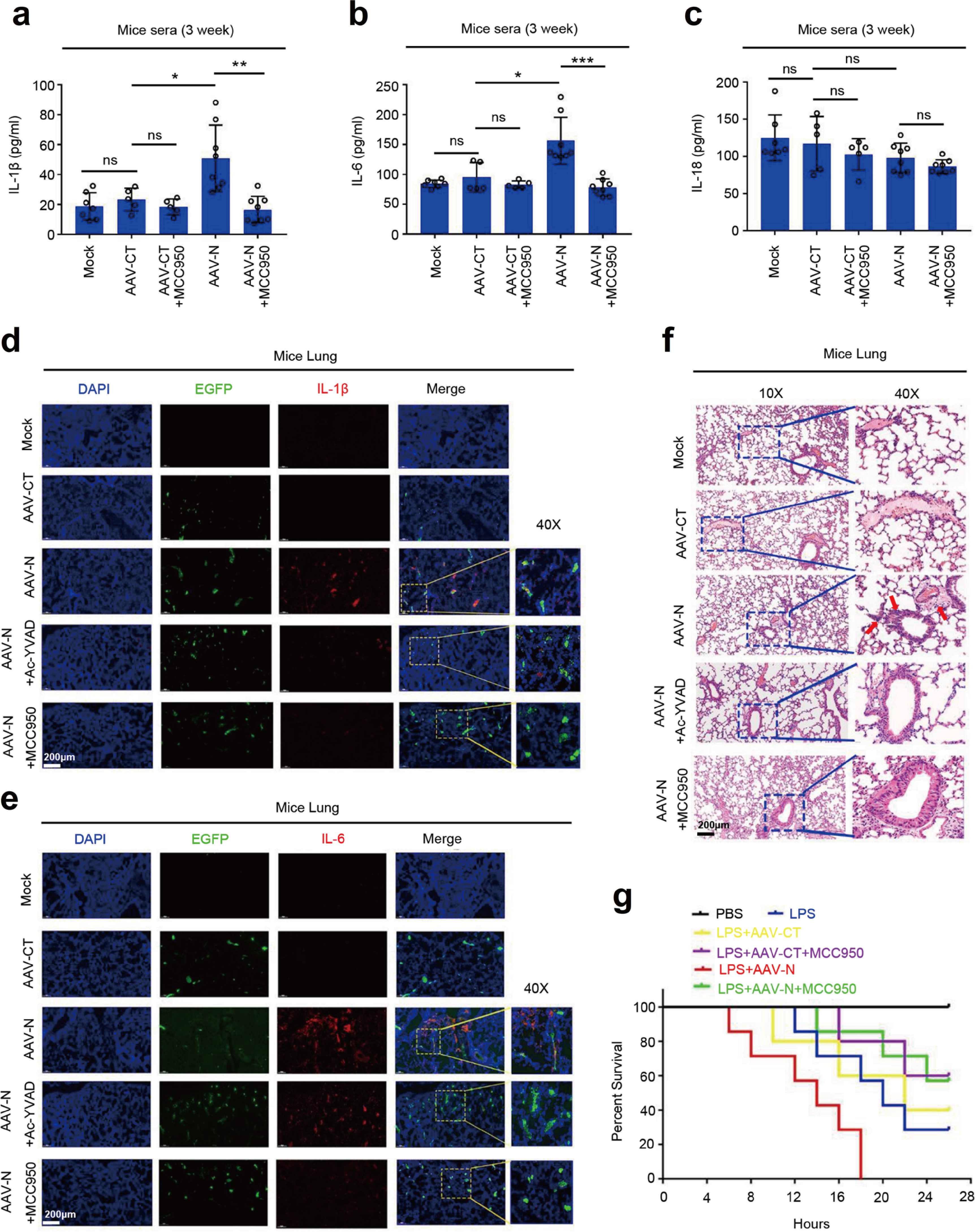 接下来,研究人员对SARS-CoV-2 N蛋白在激活NLRP3炎症小体的生物学作用进行评价。通过在C57BL/6小鼠表达N蛋白,探究N蛋白在肺损伤中的作用。注射AAVlung-N的小鼠,血清中IL-1β和IL-6的水平明显高于对照组,且Ac-YVAD-cmk和MCC950均可抑制该反应(Fig.8a&8b),但AAVlung表达N蛋白并未影响血清中IL-18的表达(Fig.8c)。AAVlung感染的小鼠肺部免疫荧光结果显示,AAVlung-N小鼠肺部IL-1β和IL-6表达明显高于其他分组,Ac-YVAD-cmk和MCC950均可降低IL-1β和IL-6表达(Fig.8d&8e)。HE染色显示,携带AAVlung-N的小鼠肺部有明显的的炎症病变及组织损伤,Ac-YVAD-cmk和MCC950均可抑制肺组织的病变(Fig.8f)。这些结果表明NLRP3炎性小体是N蛋白诱导的小鼠肺损伤发生所必需的。