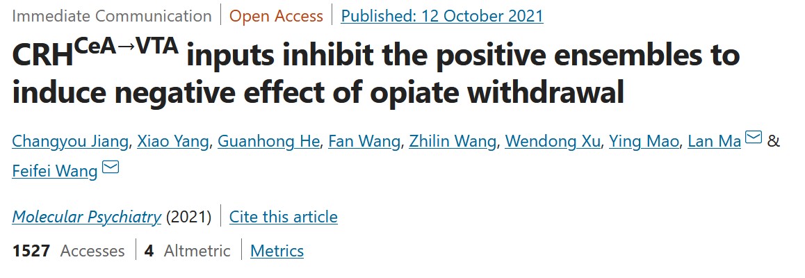 [3]Changyou Jiang, Xiao Yang, et al. CRHCeAVTAinputs inhibit the positive ensembles to induce negative affect of opiate withdrawal. Mol Psychiatry. 2021 Oct 12.doi: 10.1038/s41380-021-01321-9.