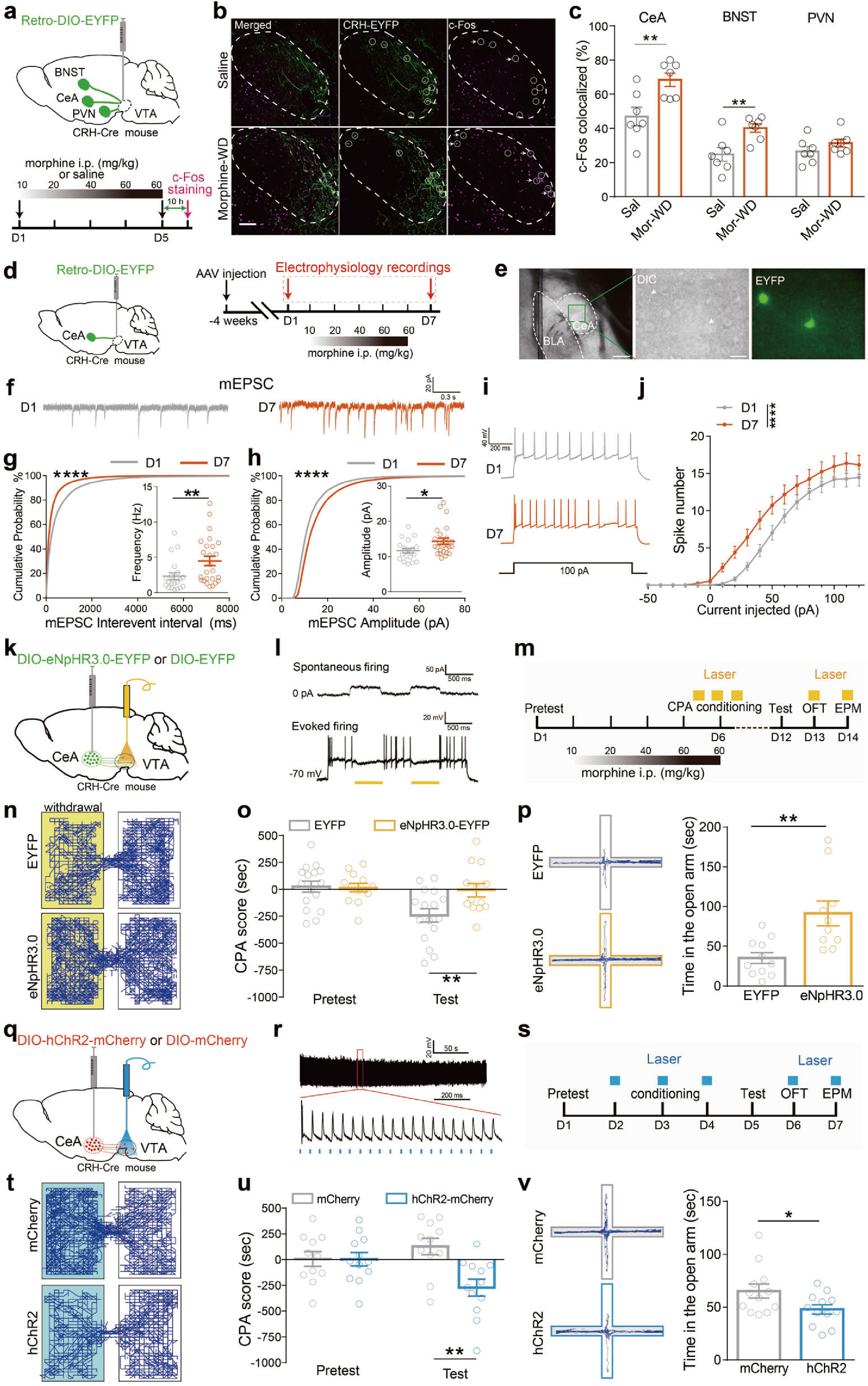 接下来,研究人员在CRH-Cre小鼠CeA注射AAV-DIO-hChR2-mCherry,VTA区注射AAV-RAM-tTA-TRE-EGFP,借助Dox标记体系和光遗传学技术发现,吗啡慢性给药促使CeA中CRH神经元向VTA多巴胺能吗啡神经元集群的抑制性连接增强(图4h-s)。
