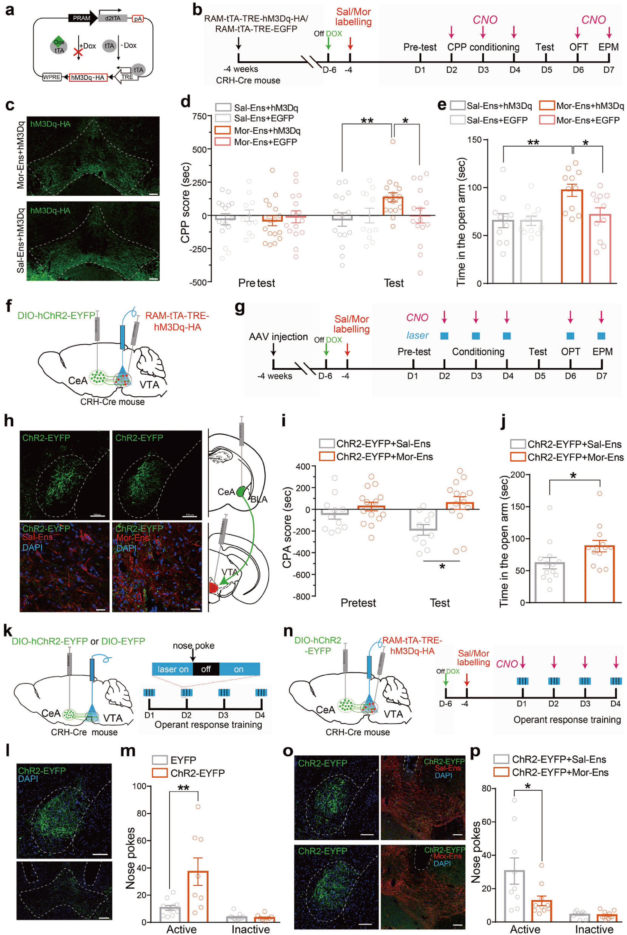 为观察VTA吗啡神经元集群的激活是否能缓解由CRHCeAVTA连接增强引起负性情绪,研究人员在CRH-Cre小鼠CeA注射AAV-DIO-hChR2-EYFP,VTA注射AAV-RAM-tTA-TRE-hM3Dq病毒,借助CPA和EPM行为学范式发现,光遗传激活CRHCeAVTA通路导致的小鼠表现出条件性位置厌恶,同时进入开放臂的次数减少,表现出焦虑样行为,而化学遗传激活VTA吗啡神经元集群则有效改善了这一现象(图5f-j)。