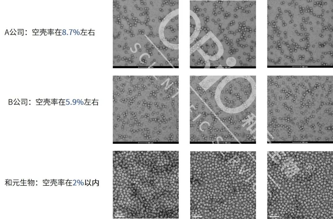 2021年,我们选择同一载体、不同生产厂商的腺相关病毒,发起了空壳率双盲测试,电镜结果显示,米乐生物的腺相关病毒空壳率远低于行业一线品牌。