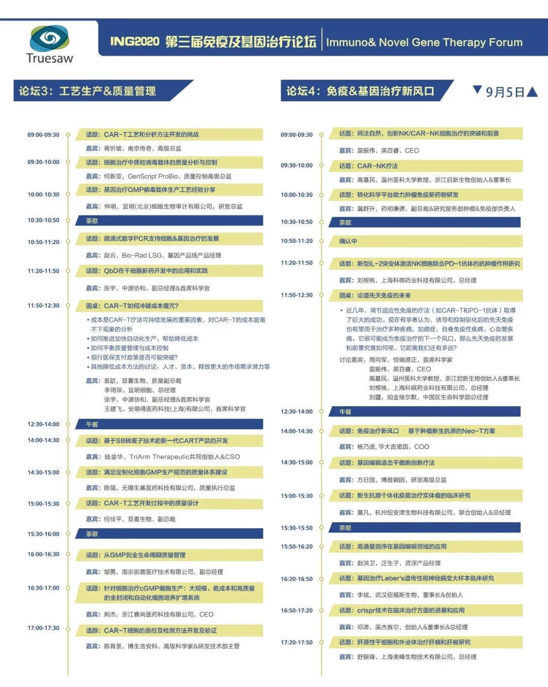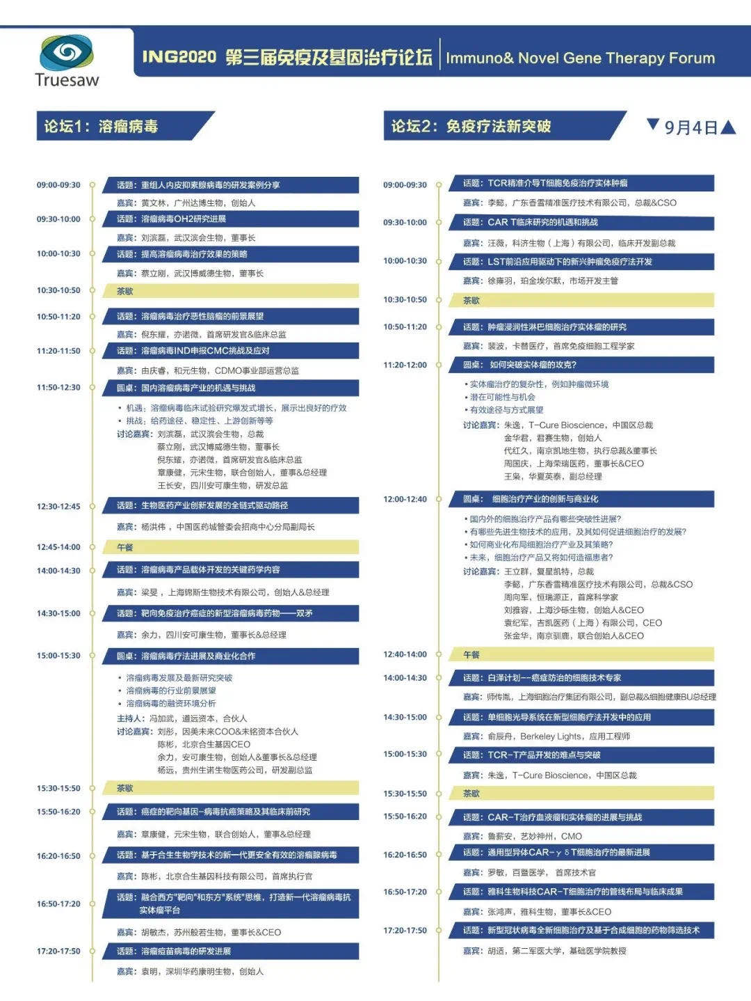 ING第三届免疫及基因治疗论坛将于2020年9月4日-5日在上海圣诺亚皇冠假日酒店(上海市普陀区金沙江路1699号)举办。届时,论坛将分为四个分会场,从溶瘤病毒、传统免疫疗法新突破、工艺质量和质量管理,以及免疫和基因治疗的新突破共四个维度,邀请60+行业领袖代表分享最新的研究成果,共商免疫疗法新趋势!